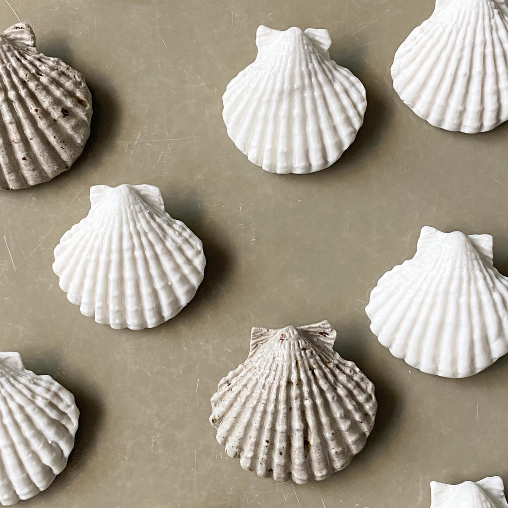 Lille porcelæns musling med brochenål.