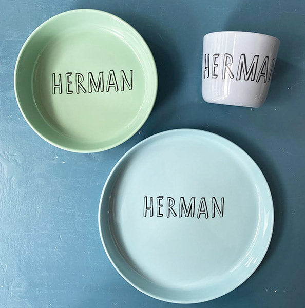 Få et sæt med kop, skål og tallerken med dit barns navn på.