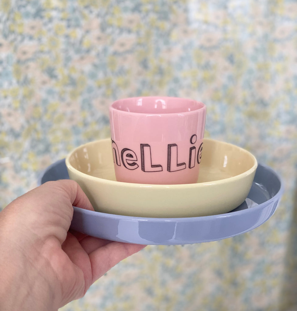 Få et sæt med kop, skål og tallerken med dit barns navn på.