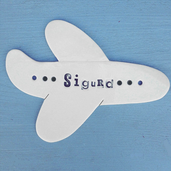 Børneskilt med form som en flyvemaskine med barnets navn på.