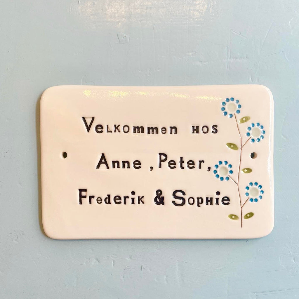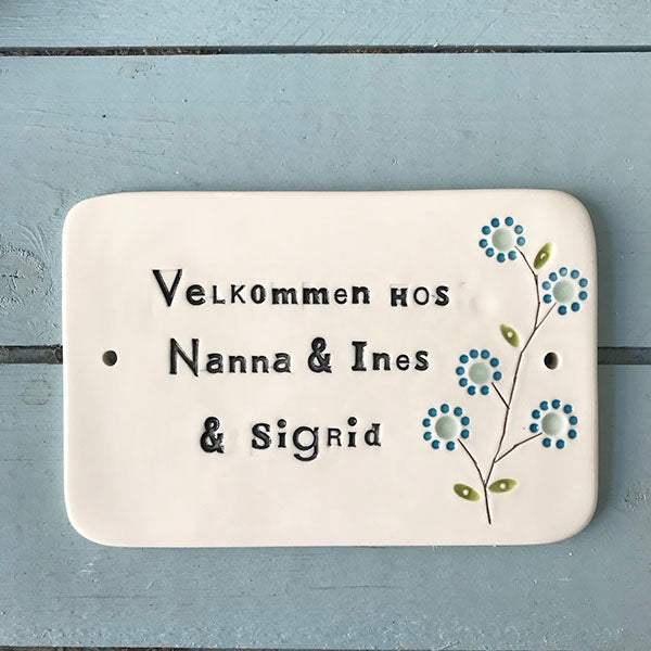 Dette navneskilt er med "Velkommen hos" med blandede bogstaver og med blomsterdekoration.