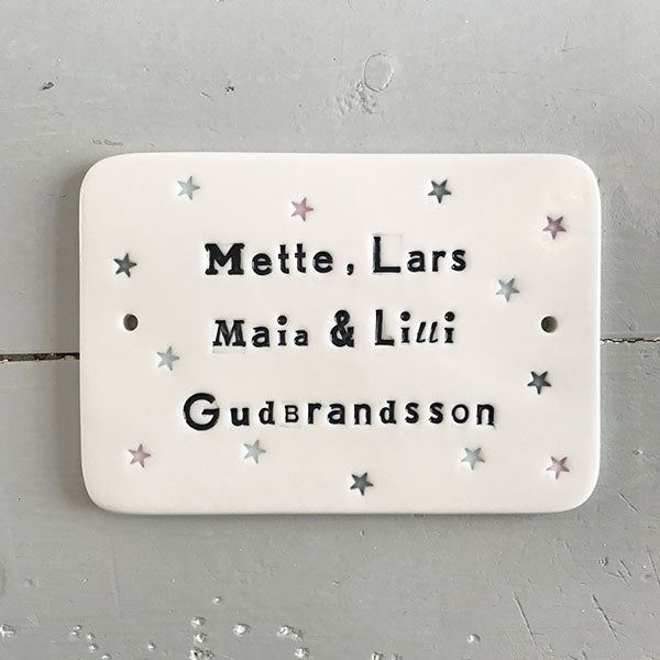 Dette navneskilt er dekoreret med stjerner og med tekst i blandede bogstaver.