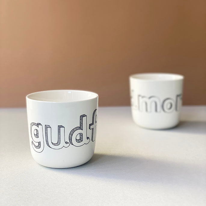 Materiale: hvid porcelænFarve: sort tekstTekst : gudfarMål: H 8,5 cm. Ø 9 cm.